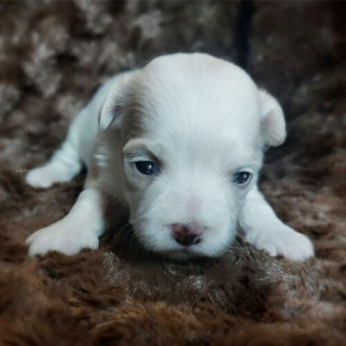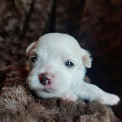 犬種:チワマル (チワワ×マルチーズ) 毛色:ホワイト 生年月日:8月29日 性別:女の子 特徴:パパの色を少しだけ引き継いだカラーです😌