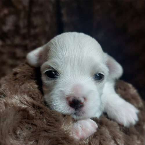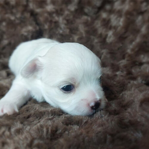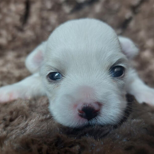 犬種:チワマル (チワワ×マルチーズ) 毛色:ホワイト 生年月日:8月29日 性別:男の子 特徴:パパの色を少しだけ引き継いだカラーです😌