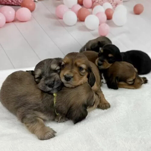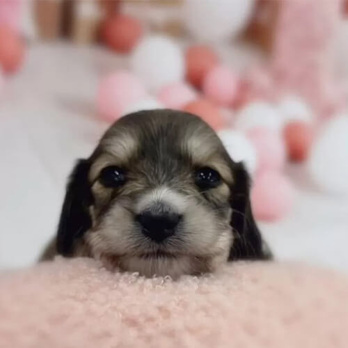 犬種:ミニチュアダックスフンド(ロング) 毛色:シェーデッドイエロー 生年月日:11月8日 性別:女の子 特徴:兄弟の中で1番小柄な可愛い女の子☺️