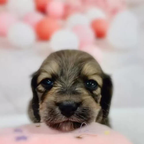 犬種:ミニチュアダックスフンド(ロング) 毛色:シェーデッドイエロー 生年月日:11月8日 性別:男の子 特徴:おめめパッチリ😊